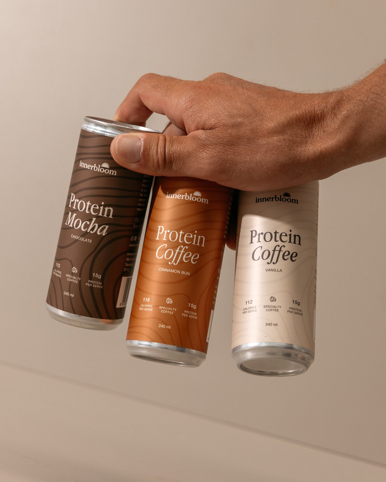 Two cans of Protein Coffee being held against a beige background