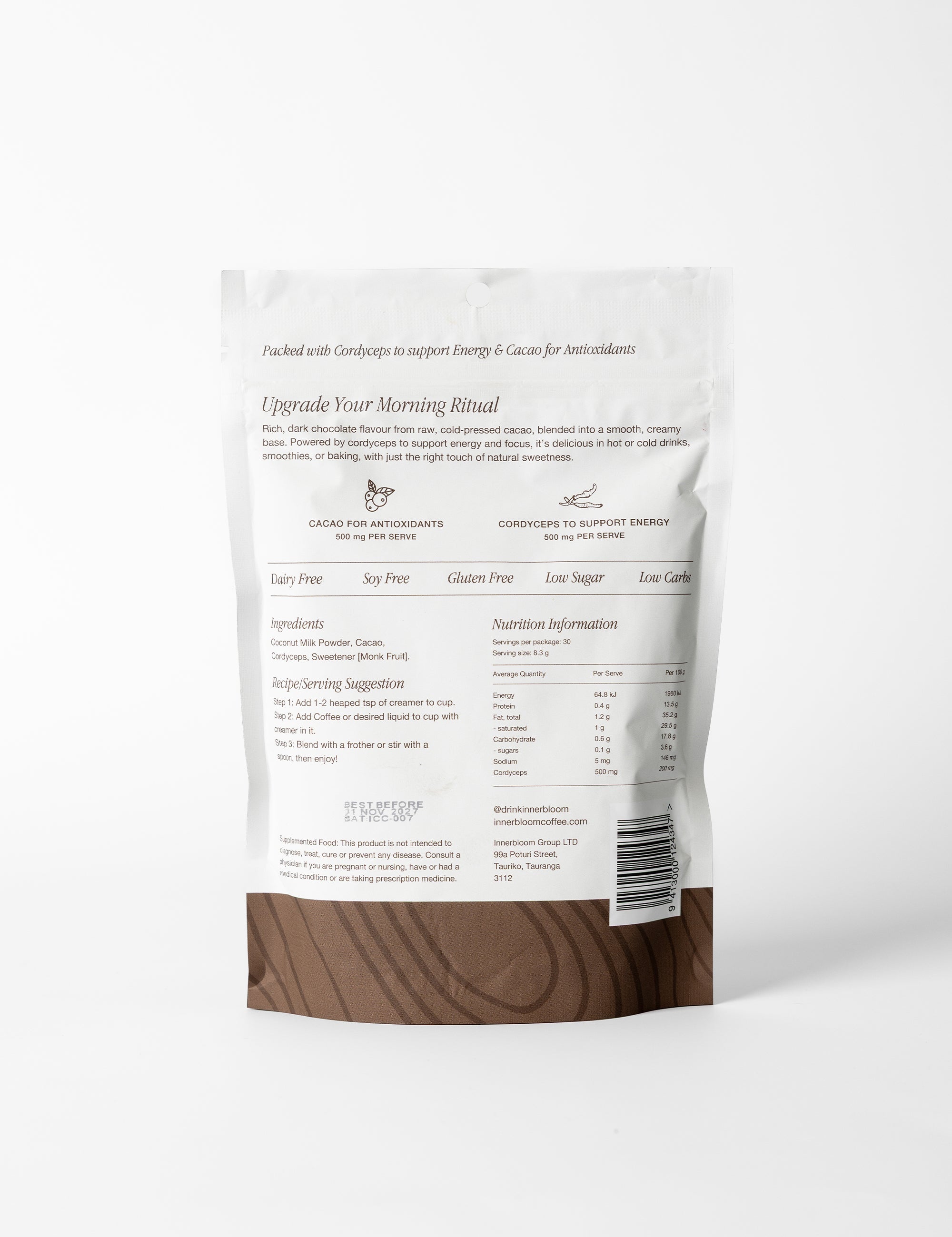 Ingredients: Organic Cacao Powder, Organic Coconut Milk Powder, Cordyceps Extract 10:1 and Monk Fruit