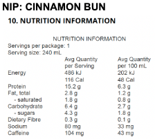 Ingredients: Water, Brewed Coffee (14%) [Water, Roasted Coffee Beans (20%)] Ultra filtered skim milk (6.3%), Whole milk powder (3.5%), Cinnamon, Natural flavours, Salt, Natural sweetener (Monk Fruit)